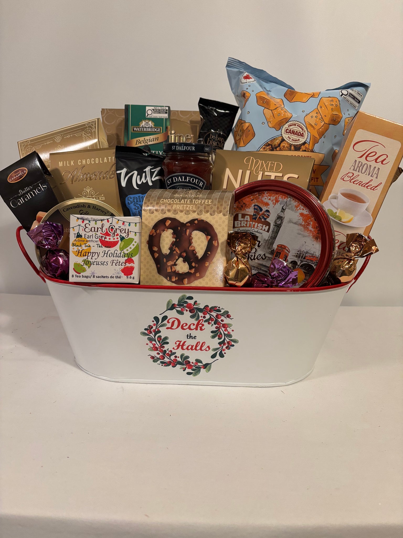 Cavendish & Harvey Drops, Be-Bop Biscotti, St. Dalfour Strawberry Fruit Spread, From Farm to Table Sea Salt Caramel Candied Popcorn, La British Premium Butter Cookie Tin, Nutz Salty Sweet Mix, Maitre Truffout Chocolate Sticks, Pirouline Wafers, Snacktales Milk Chocolate Almonds, Snacktales Chocolate Pretzel With Toffee Bites, Heavenly Caramel Bites, Tea Aroma Blended, Mixed Nuts, Snack Mix, Christmas Tea